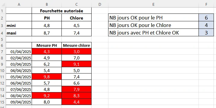 B7:C15 Petite révision : Avec la mise en forme conditionnelle, faire sortir les valeurs hors fourchette en police blanche et fond de cellule rouge