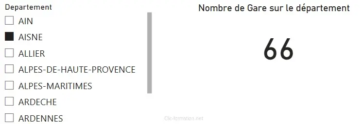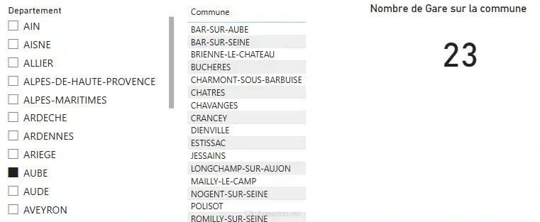 L'objectif de l'exercice consiste à créer une mesure qui convertie l'entrée "Communes" en valeur pour établir des visuels qui vont indiquer le nombre de gares par communes/département. La fonction COUNT est faite pour ça. Dans la vue table, vous suivez le process de 1 à 4.