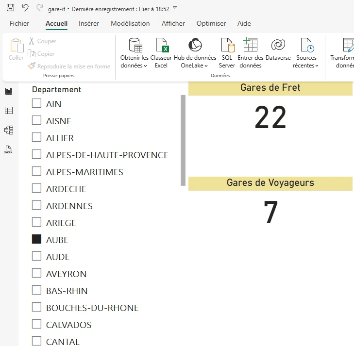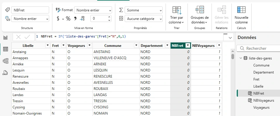 Après import du fichier, vous constatez que les colonnes "Fret" et "Voyageurs" sont renseignées avec des "N" pour non et "O" pour oui. Nous allons créer une nouvelle mesure qui va convertir ces deux lettres en "0" ou "1". La création d'une visualisation "Carte" sera plus simple.
