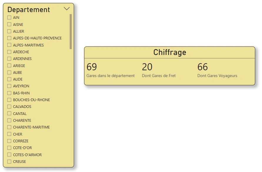 Dans ce fichier Excel, les colonnes gares de fret et gares voyageurs sont désignés par N ou O. Pour calculer leur nombre, il nous faut utiliser la fonction CALCULATE combiné à COUNTROWS, en calculant le nom de O (pour "oui"). Pour le nombre de Gares dans le Département, il suffit de compter le nombre d'occurrences de chaque département pour en savoir le nombre. La fonction COUNT, vu dans un exercice précédent, sera suffisante.