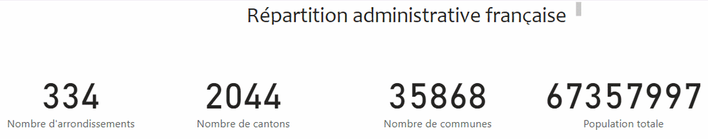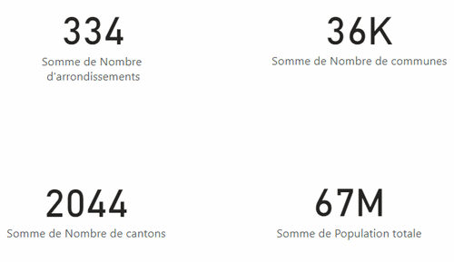 Vous glissez la carte chiffrée à 4 reprises en glissant les champs : Nombre d'arrondissements, Nombre de cantons, Nombre de communes, Population totale. Vous obtenez les résultats bruts ci-dessous.