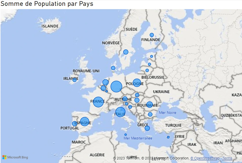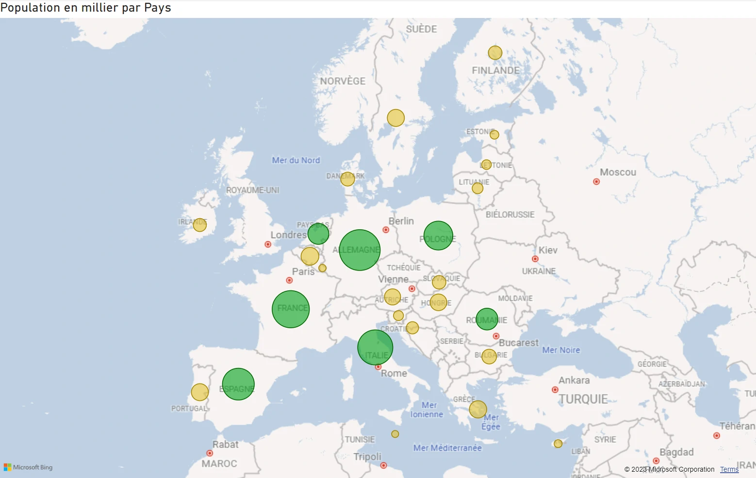 Le fichier Excel reprend simplement la liste des pays européens et le nombre d'habitants par pays. De base, les valeurs sont représentées par des ronds bleus de diamètres plus ou moins important en fonction de la population. Dans la version finale, les pays de + de 10 millions d'habitants seront verts et les pays inférieurs à 10 millions d'habitants en jaune.