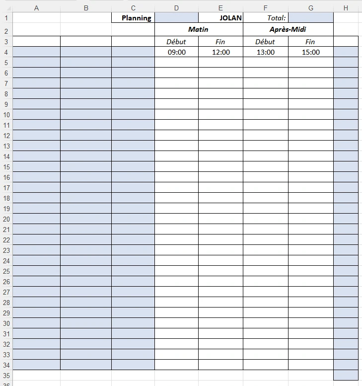 H4:H34 Zone de calcul du temps de travail du matin et de l'après-midi de chaque jour. Soustraction et addition