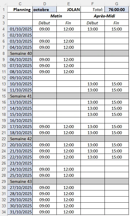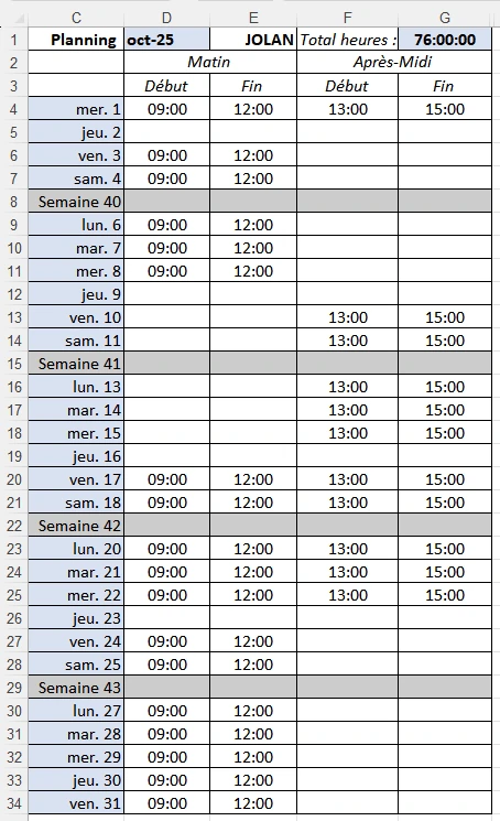 Pour la colonne C et pour personnaliser l'affichage des jours en lieu et place de la date, vous pouvez sortir un format personnalisé du genre "lun.3" à la place de 3/10/2025. Il vous faudra combiner la fonction SI avec NO.SEMAINE et les fonctions CHOISIR et JOURSEM. Il faut quand même réfléchir un peu.