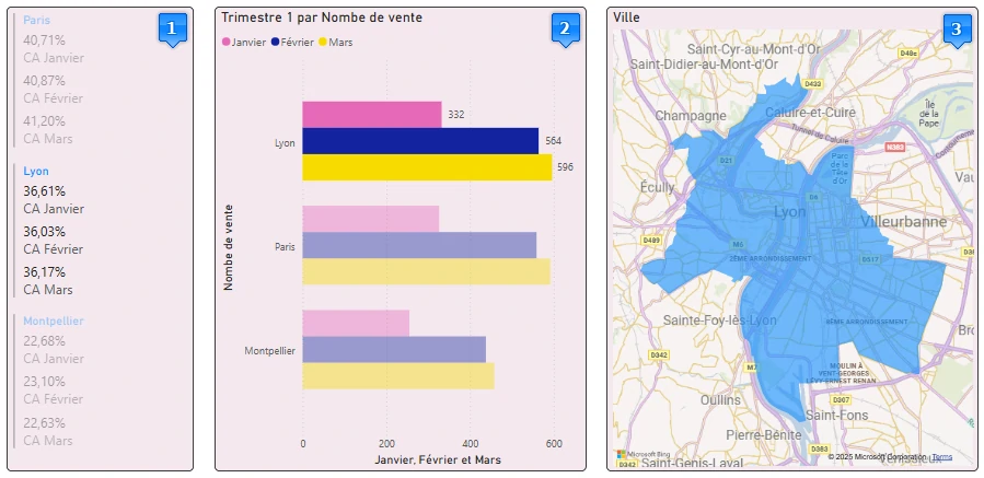 Repère 1 : Carte à plusieurs lignes avec le CA Janvier, Février et Mars en affichant la valeur comme pourcentage et les villes.