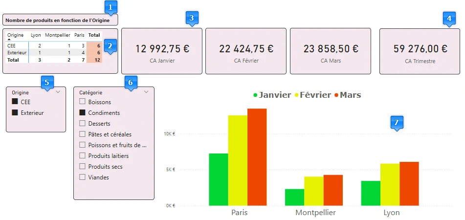 Repère 7 : Histogramme groupé avec les villes en X et le CA Janvier, Février et Mars en Y. La couleur des colonnes est à customiser