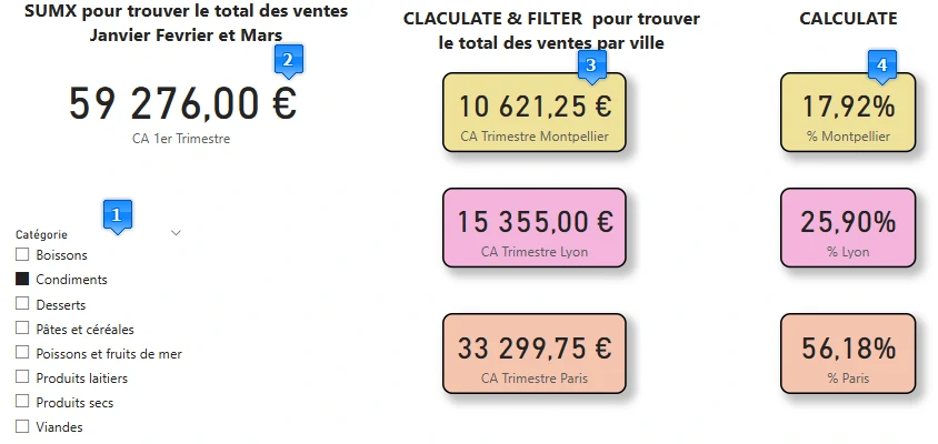 Repère 3 : Carte chiffrée avec la mesure CALCULATE CA trimestre et FILTER sur la ville