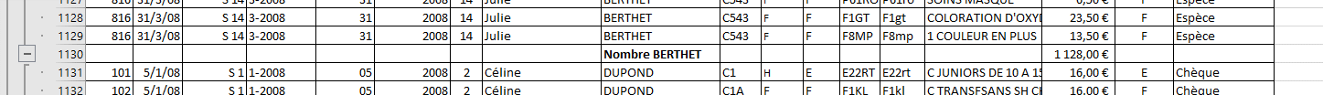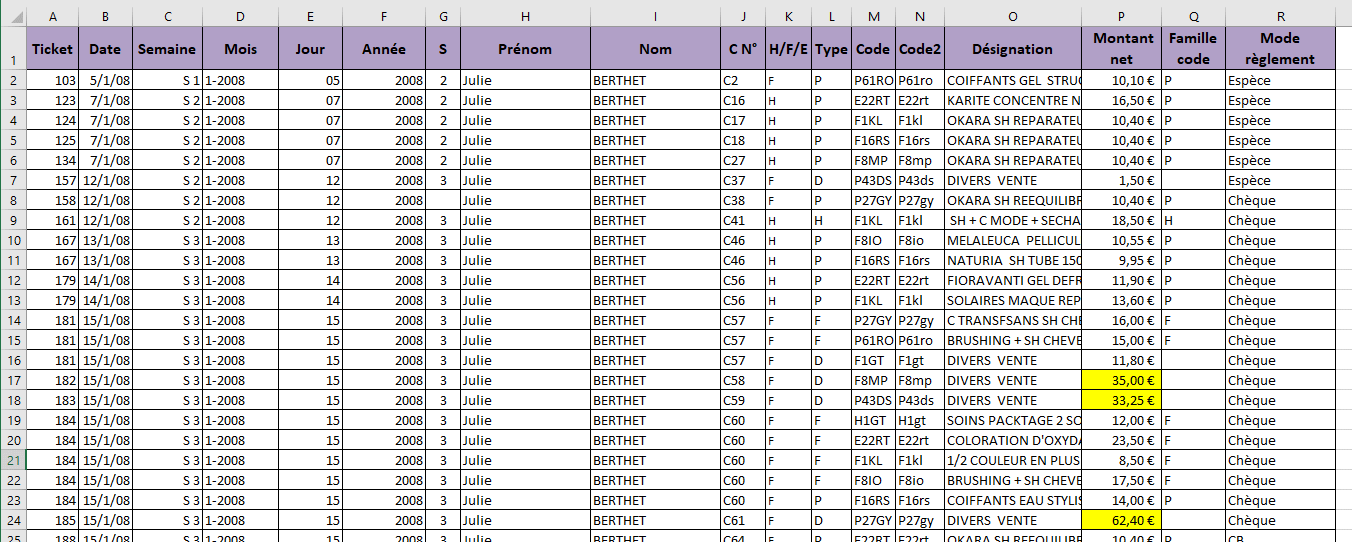 Séparez les noms et prénoms de la cellule H afin que les noms apparaissent dans une nouvelle colonne nom. La colonne "coiffeuse" change en colonne "prénom"