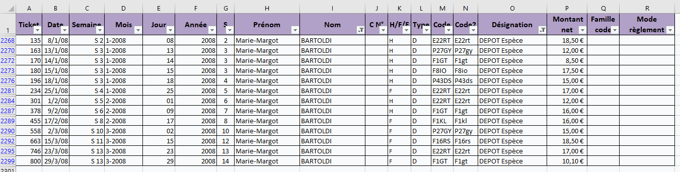 Filtrer le tableau sur place pour obtenir la liste des dépôts en espèce de Bartholdi