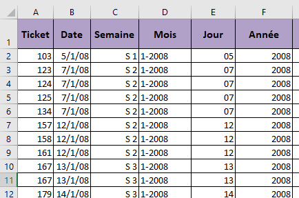 Manipulation des dates : en colonne D, par rapport à la date de la colonne B, vous déterminez le numéro de semaine, en colonne D le mois et l'année, en colonne E le jour et Année pour la colonne F