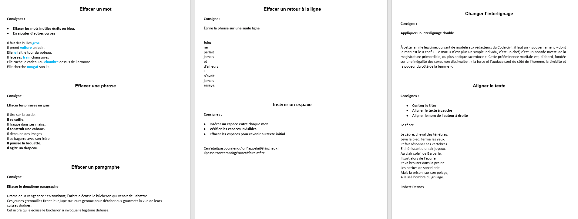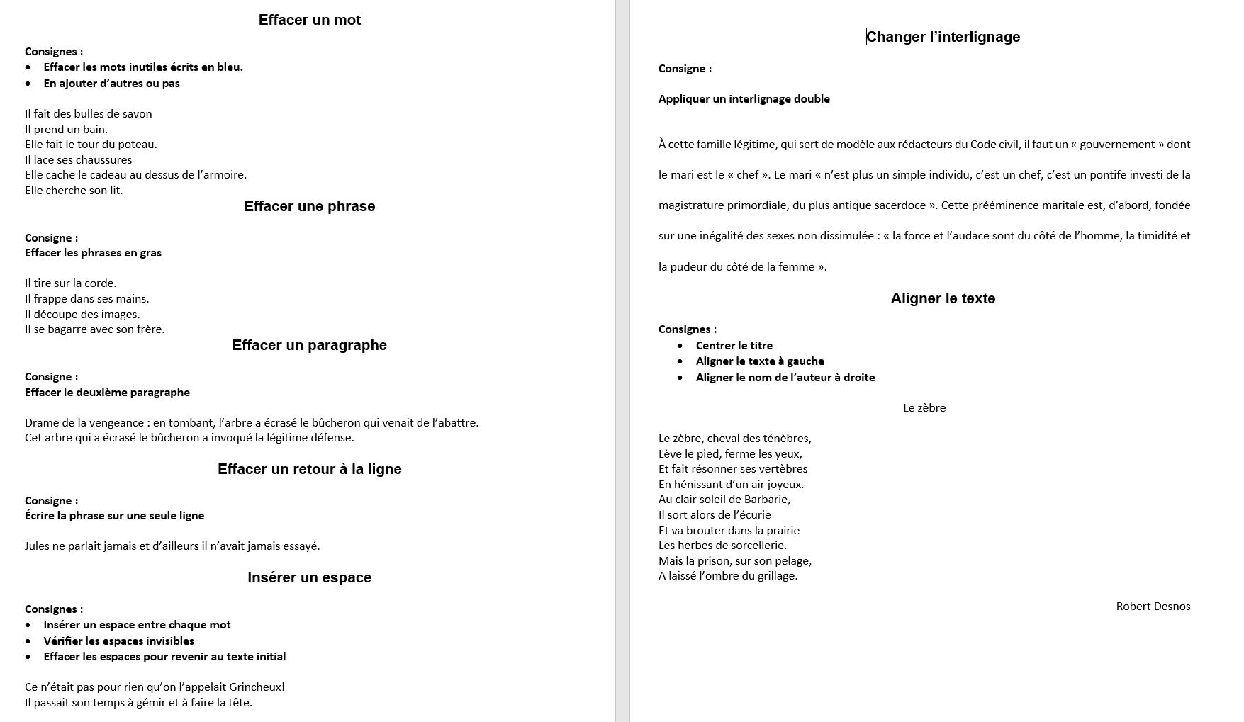 7 Exercices sur le même document pour manipuler : l'effacement des mots, de phrases, de paragraphes, de retour à la ligne, l'insertion d'espace, changement d'interligne et l'alignement du texte.