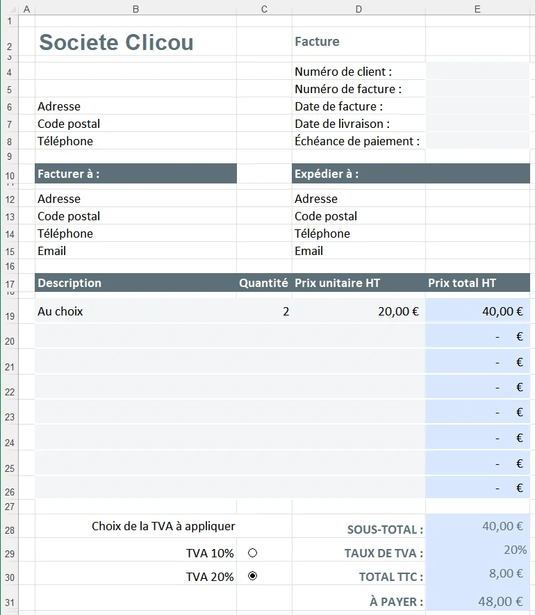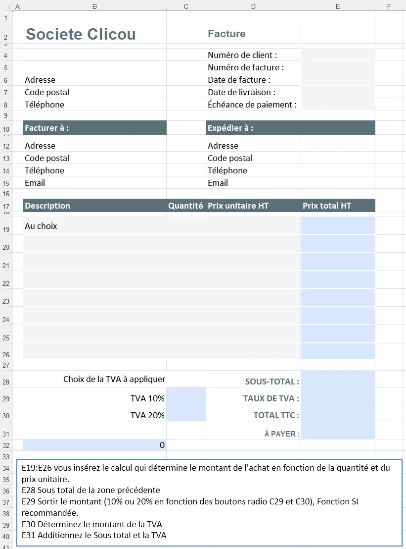 C29 et C30, vous insérez un bouton radio qui permet de valider le montant de la TVA