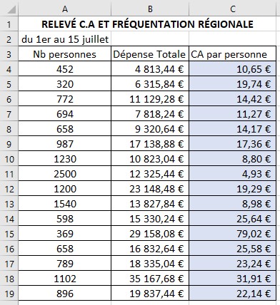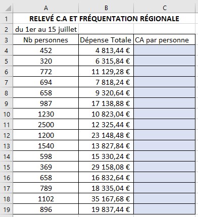 Vous faites la division dans la colonne C pour trouver le chiffre d'affaires par personne