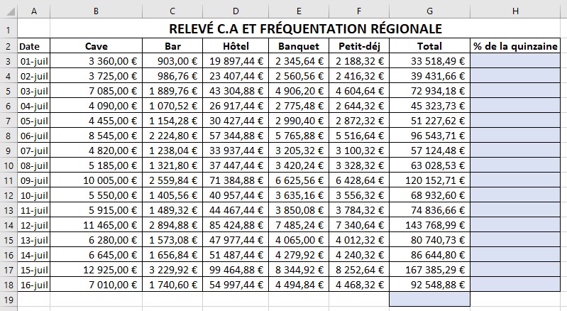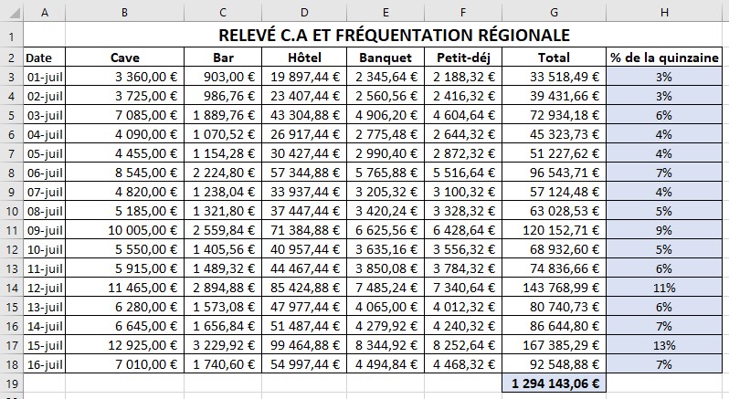 Dans un premier temps, vous faites la somme des CA par jour, puis dans un second temps, vous faites la division qui vous permet de trouver le pourcentage de chaque jour par rapport au total de la quinzaine.