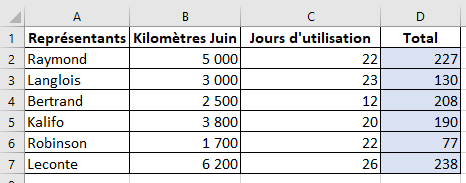 En D2, nous allons donc diviser le nombre de kilomètres parcouru en juin par le nombre de jours d'utilisation soit : "=B2/C2"