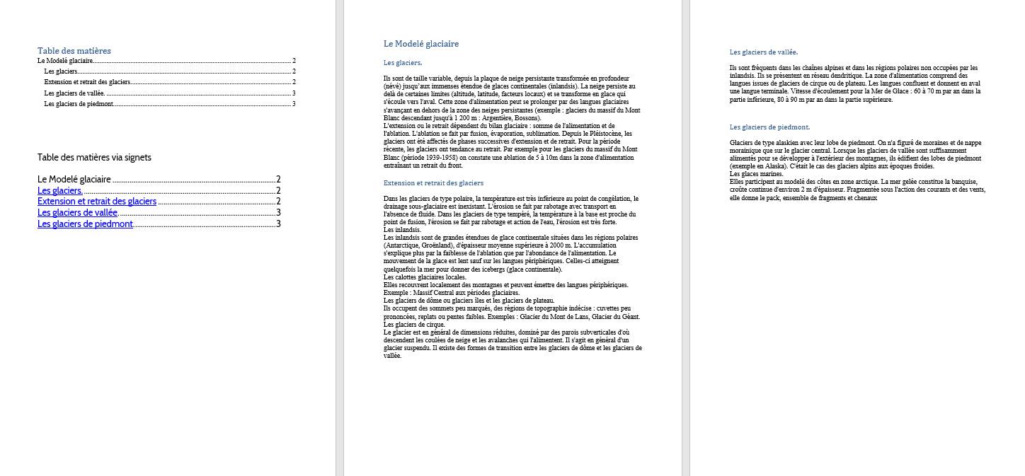 - Vous générez deux tables des matières : une classque et une via des signets que vous aurez pris soin de répartir sur le document de travail.