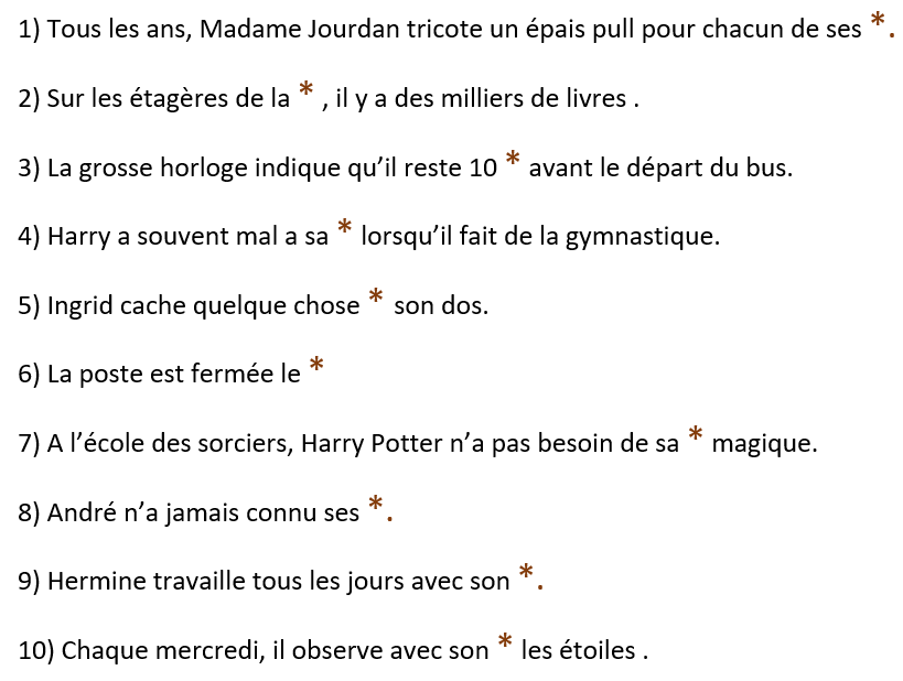 Insérez aux endroits marqués d’une * les mots manquants de la liste, pour compléter les phrases. Vous utilisez OBLIGATOIREMENT les raccourcis CTRL+C ou CTRL+X et CTRL+V
