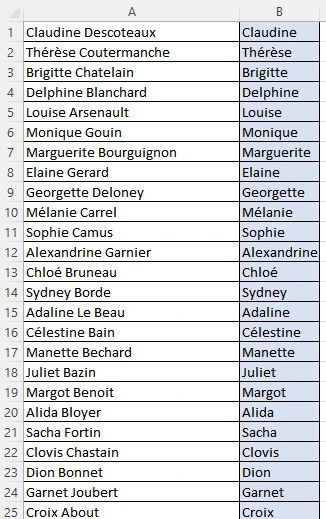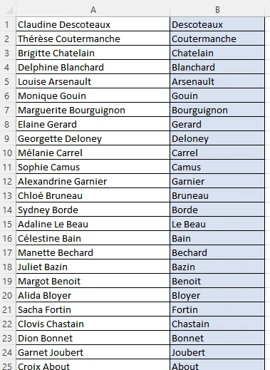 Pour les noms la colonne B : vous devez extraire le nom de chaque personne en mettant en œuvre les fonctions GAUCHE, NBCAR et TROUVE.