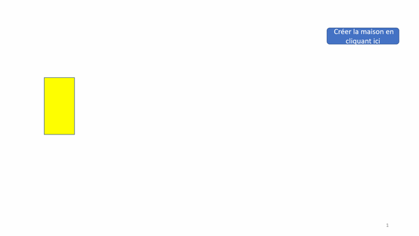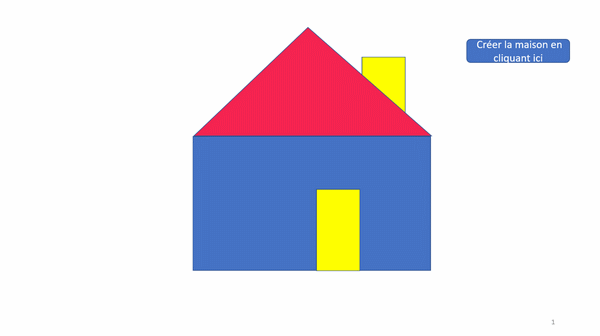 Les formes de la maison sont à créer avec des formes de couleurs et placer à l'extérieur de la diapo, au clic sur le bouton bleu les formes s'assemblent.