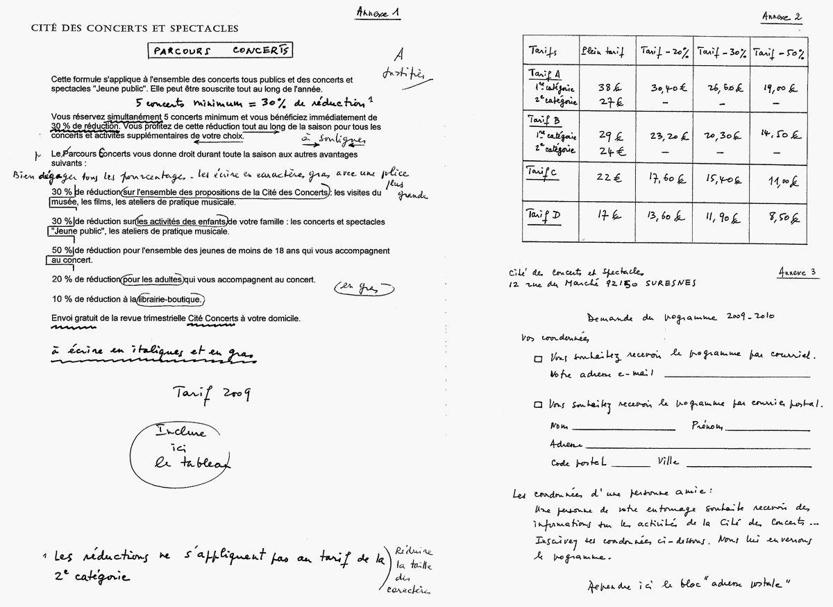 La Cité des Concerts et Spectacles propose diverses formules : parcours Concerts, activités Jeunes, activités Adultes. Différentes formules d'abonnement sont proposées au public. Un dépliant, présentant l'ensemble des programmes, est en cours de réalisation. En vous référant aux annexes 1, 2 et 3, vous présentez :