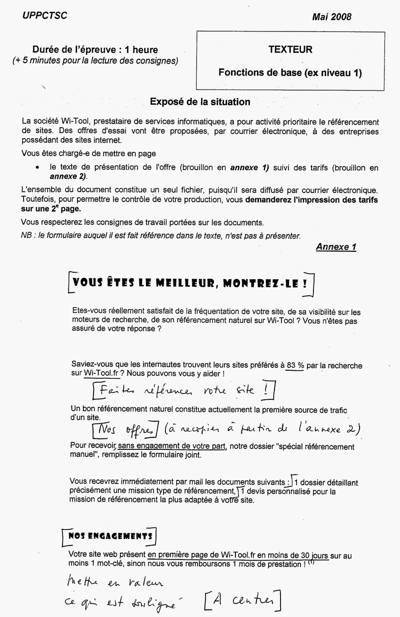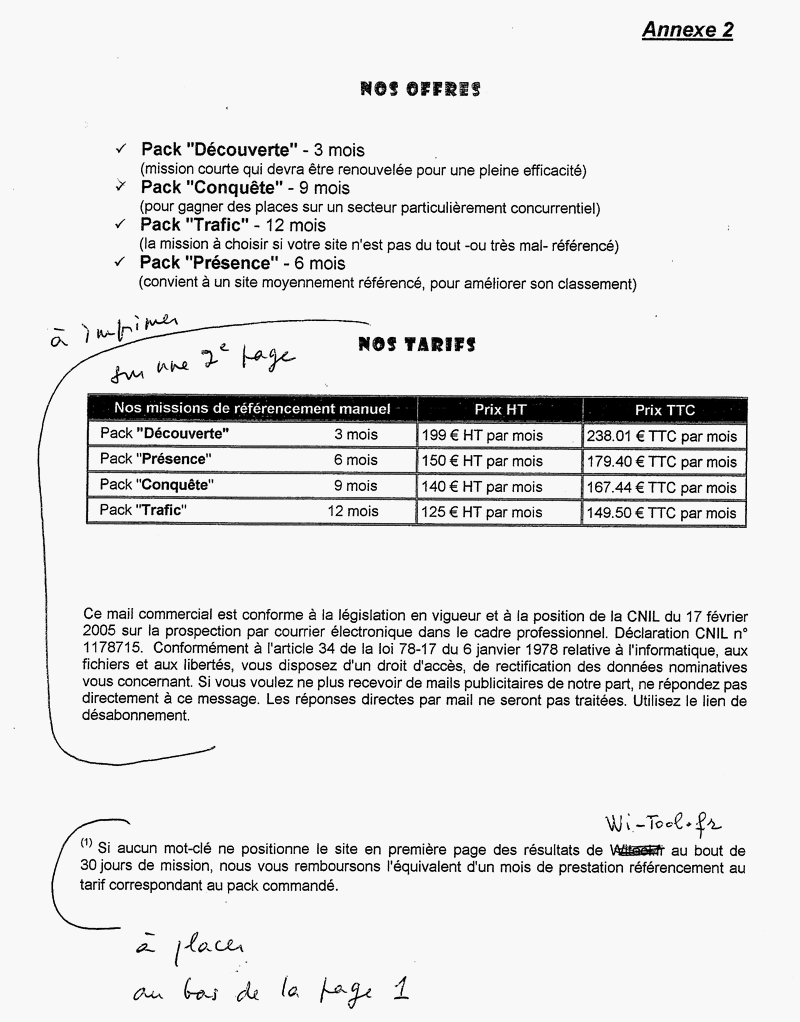 La société Wi-Tool, prestataire de services informatiques, a pour activité prioritaire le référencement de sites. Des offres d'essai vont être proposées, par courrier électronique, à des entreprises possédant des sites internet. Vous êtes chargé-e de mettre en page le texte de présentation de l'offre (brouillon en annexe 1) suivi des tarifs (brouillon en annexe 2)