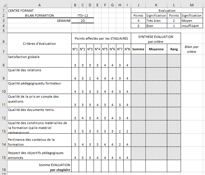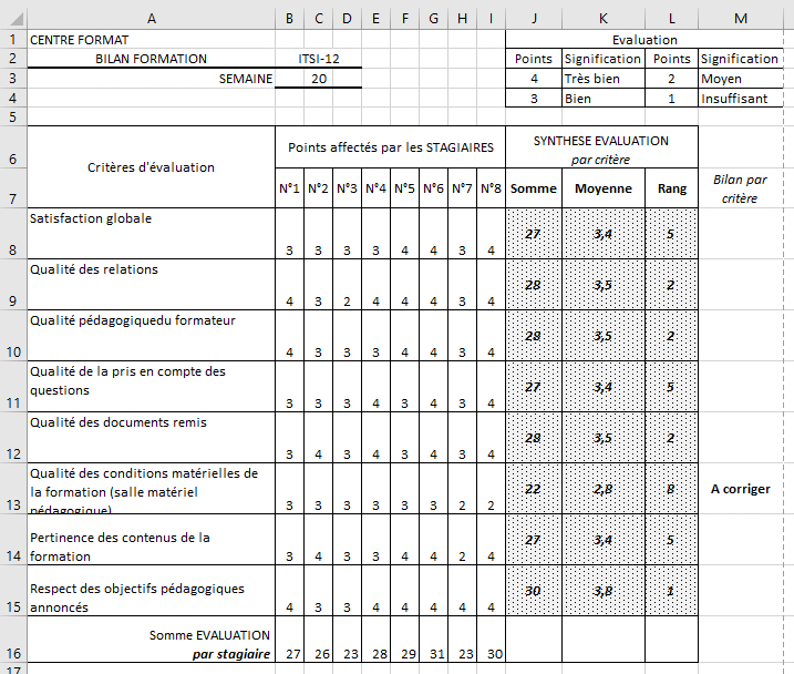 Bilan par critère = Si (la moyenne du critère est inférieur à 3 alors « A corriger » sinon ne rien inscrire)