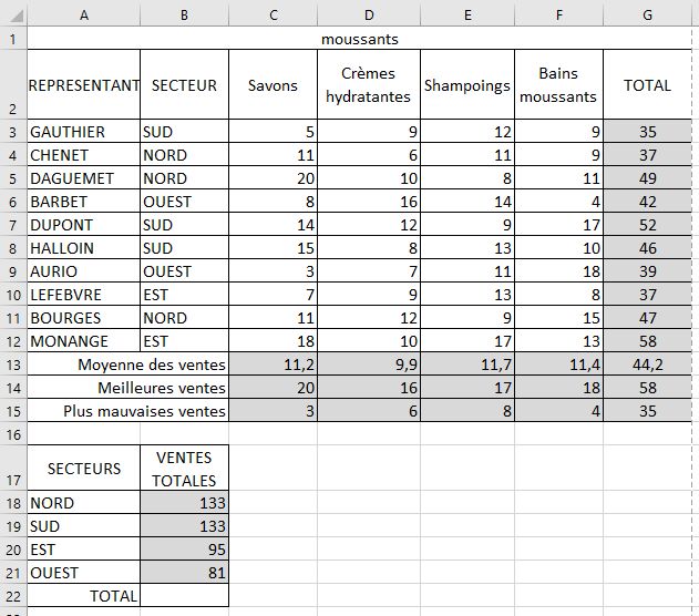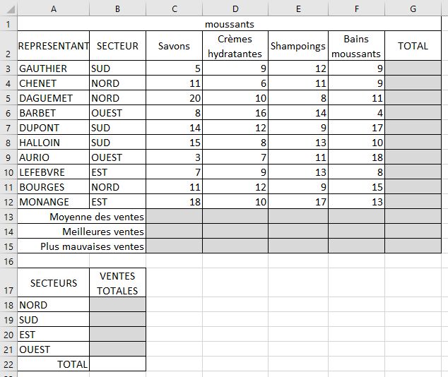 La société « GÉNÉRALE DE COSMÉTIQUES » souhaite analyser les ventes des 4 catégories de produits vendus par un ensemble de commerciaux sur différents secteurs géographiques. On vous demande, à l'aide d'une feuille de calculs, d'automatiser les résultats suivants :