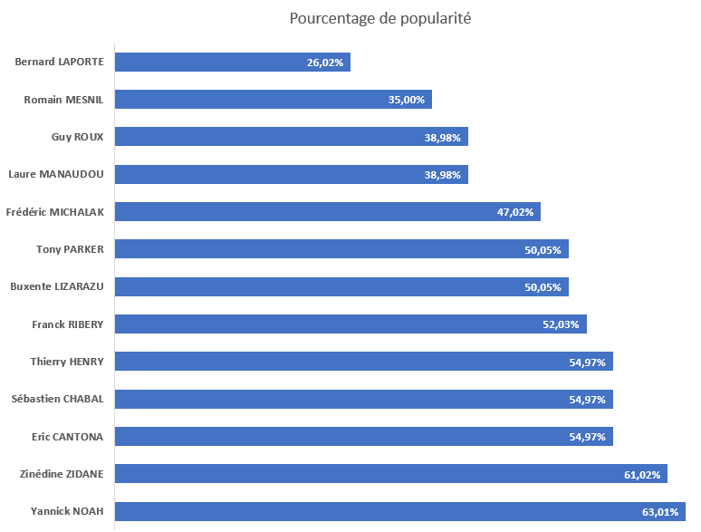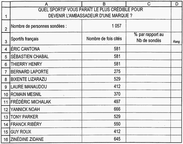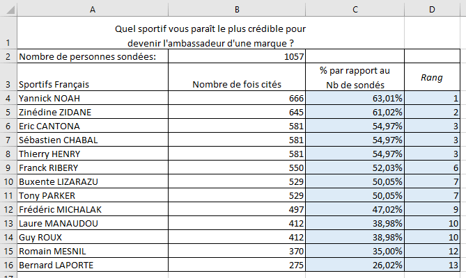 Ne pas laisser les noms en ordre alphabétique, mais en ordre croissant des % par rapport au nombre de personnes sondées, ce qui donnera le rang des treize sportifs les plus cités.