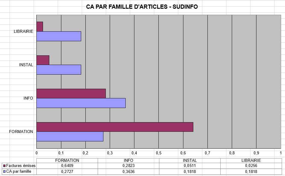 3. Éditer, après l'avoir généré sur une nouvelle feuille, un graphique à barres du récapitulatif des chiffres d'affaires par famille d'articles (% factures émises / % CA par famille)