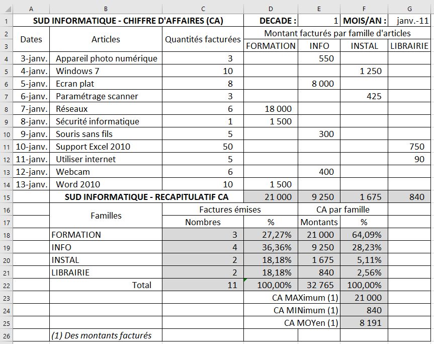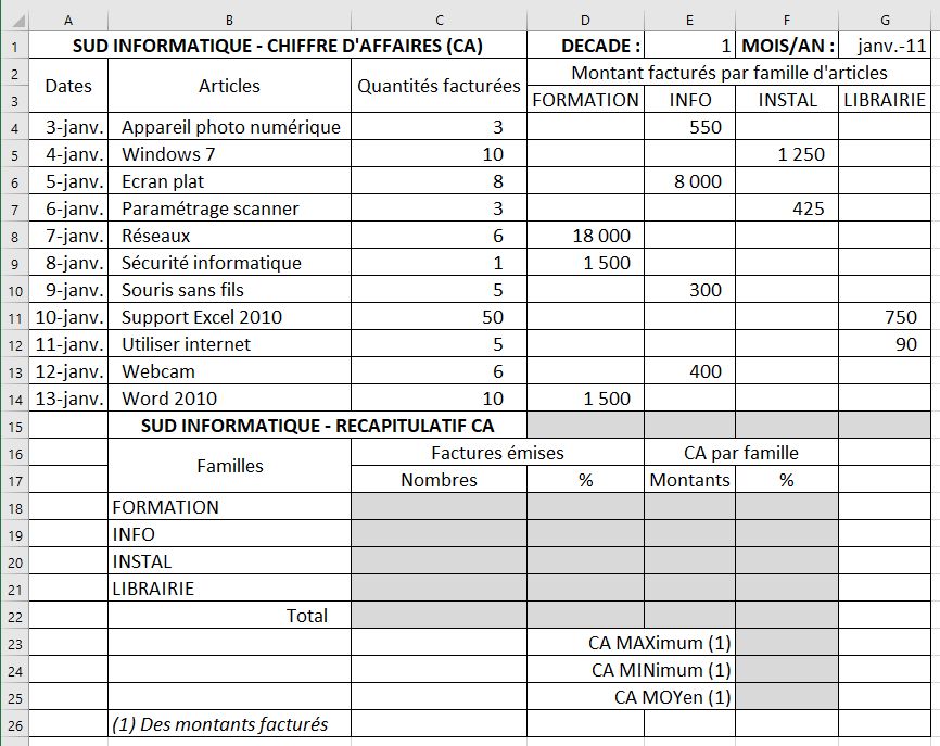 L'entreprise Sud Informatique souhaite faire une analyse de son chiffre d'affaires par famille de produits. Pour cela, elle souhaite déterminer, pour chaque famille :