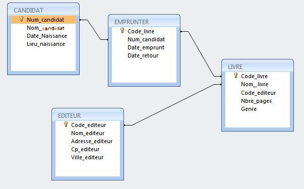 03- Afficher pour chaque candidat les livres empruntés (Numéro Candidat, Code Livre).
