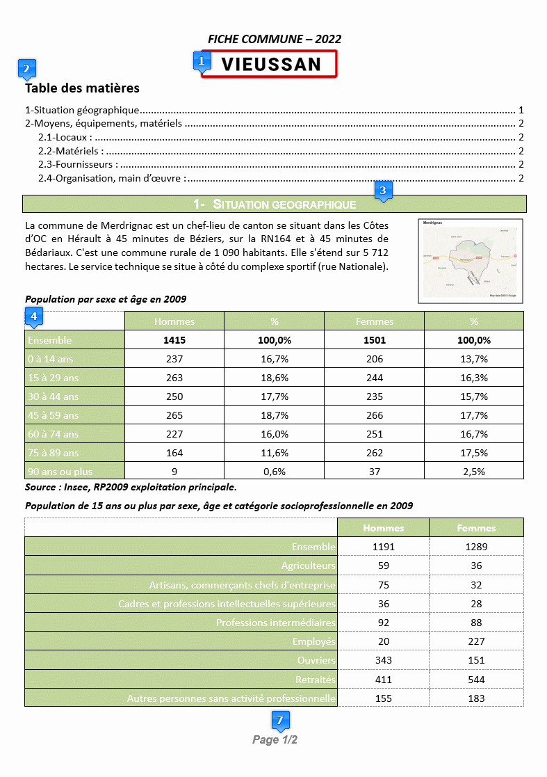 Zone 2 : Table des matières générée automatiquement depuis l'onglet "références" dans Word après insertion des titres de niveau 1 et 2
