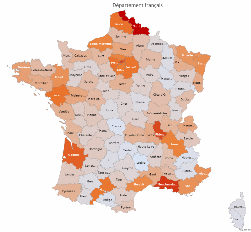 L'objectif est bien d'afficher la totalité de la métropole avec des nuances de couleurs sur les départements en fonction de leur population.