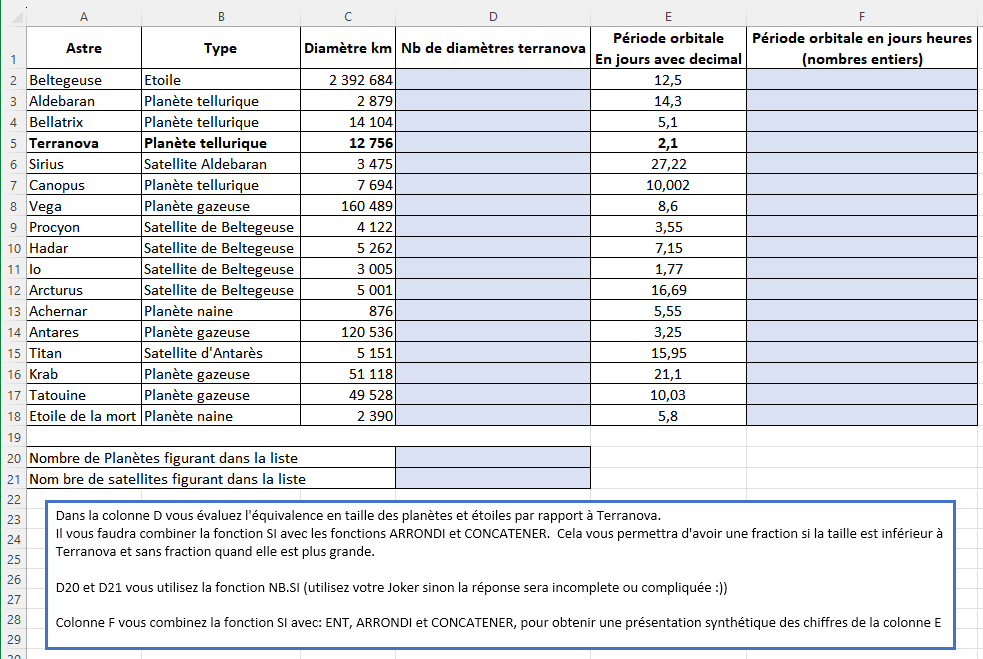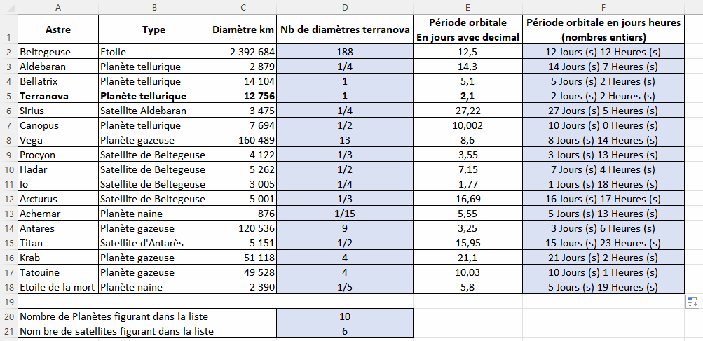 Dans la colonne D vous évaluez l'équivalence en taille des planètes et étoiles par rapport à Terranova.