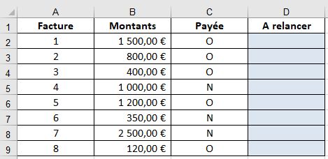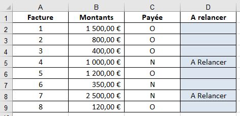 Nous devons relancer les clients qui n'ont pas payé, mais uniquement ceux qui ont une créance de 1000 € ou plus.Afficher oui ou non selon les cas dans la colonne "A relancer"