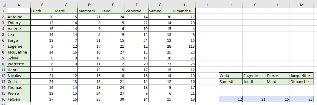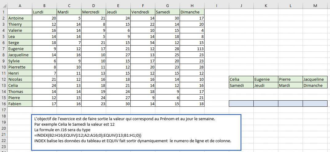 L'objectif de l'exercice est de faire sortie la valeur qui correspond au Prénom et au jour le semaine.