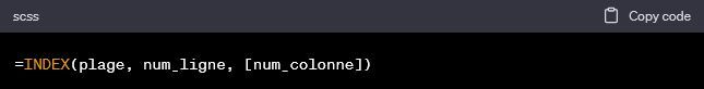 La fonction INDEX dans Excel est une fonction puissante qui renvoie la valeur d'une cellule spécifique dans une plage de cellules, en fonction du numéro de ligne et de colonne que vous spécifiez. Voici la syntaxe de base de la fonction INDEX :