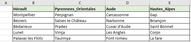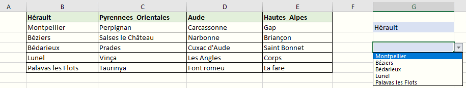 En G4 vous utilisez la fonction INDIRECT dans la validation des données et le champ source pour afficher dynamiquement les villes qui correspondent au département sélectionné en G2