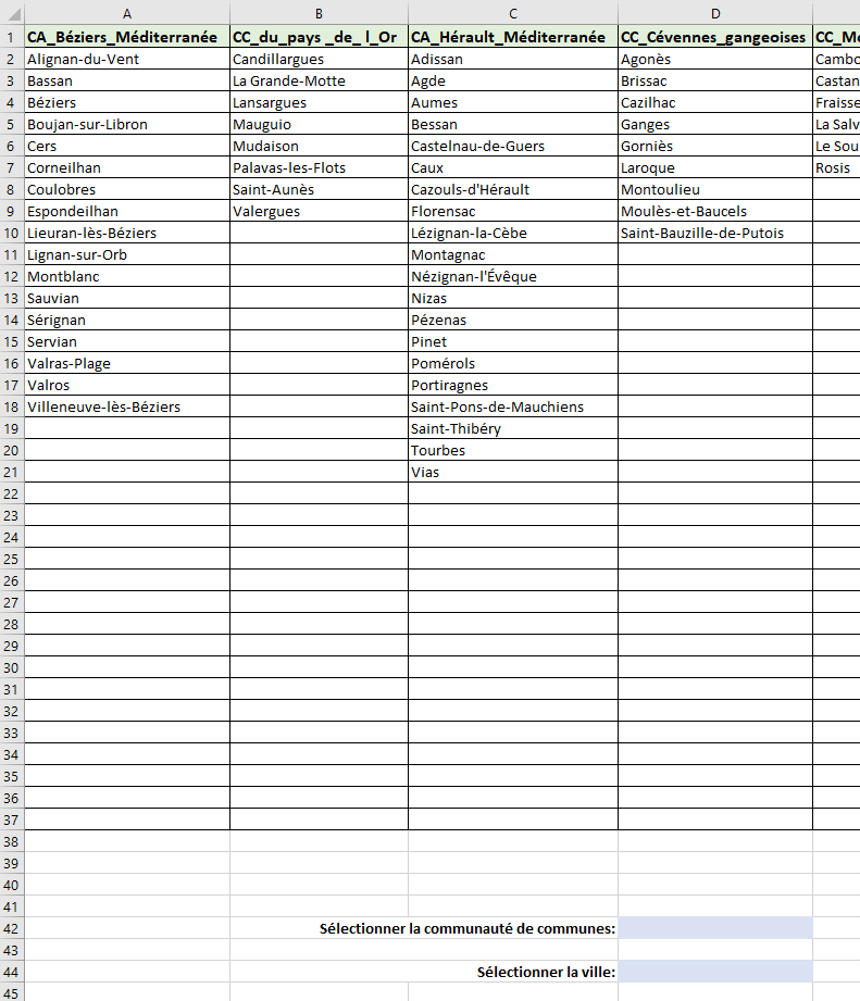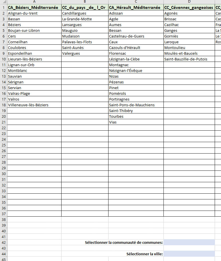 En D42, vous créez une liste déroulante grâce à la validation des données sur les noms des communautés de communes.