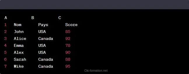 Utilisez la formule suivante : =MOYENNE.SI.ENS(C2:C7, B2:B7, "USA", C2:C7, ">80"). Cette formule calcule la moyenne des valeurs dans la plage C2:C7 (la colonne des scores) qui répondent aux critères suivants :