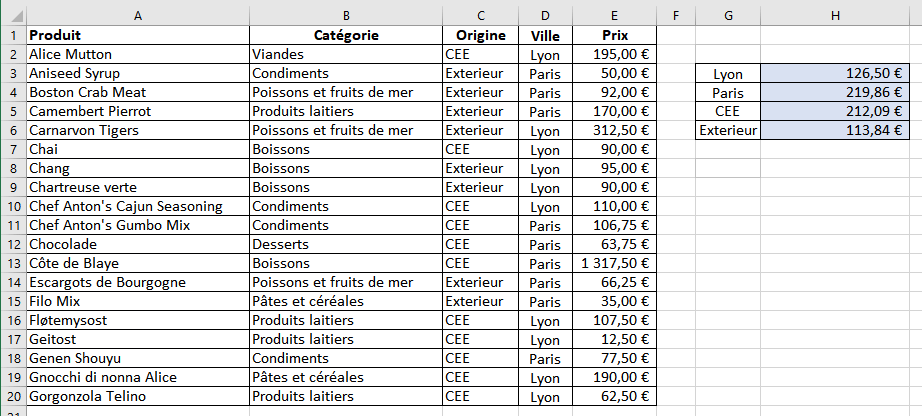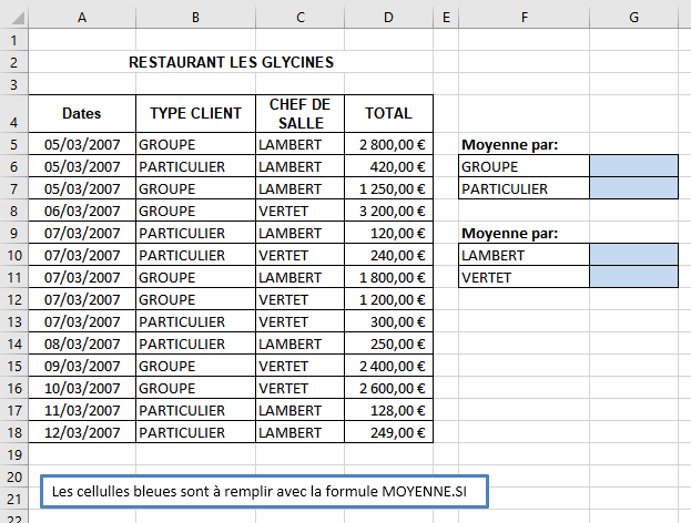 Vous pouvez télécharger votre fichier de travail ci-contre. Les cellules bleues sont à remplir avec la formule MOYENNE.SI