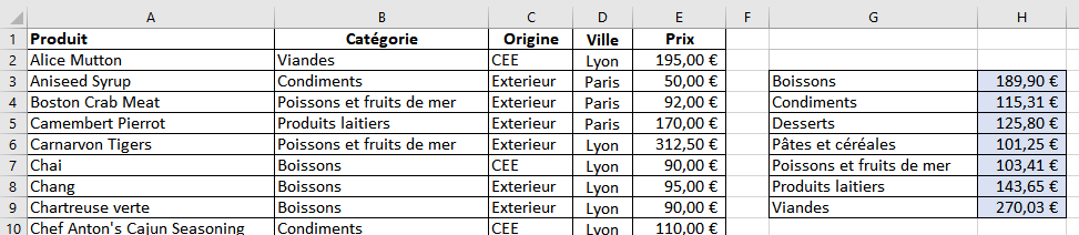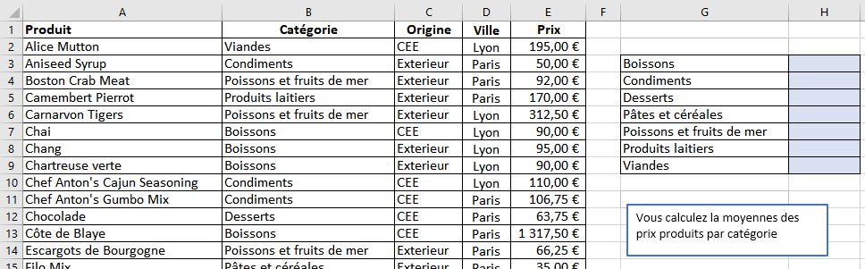 Vous pouvez télécharger votre fichier de travail ci-contre.Vous calculez la moyenne des produits vendus sur Lyon, Paris, CEE et extérieur.