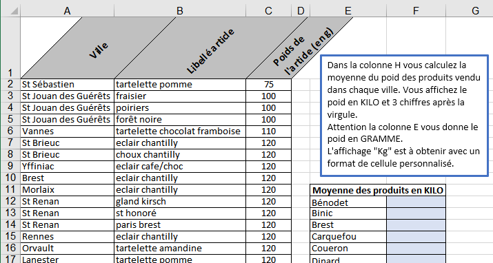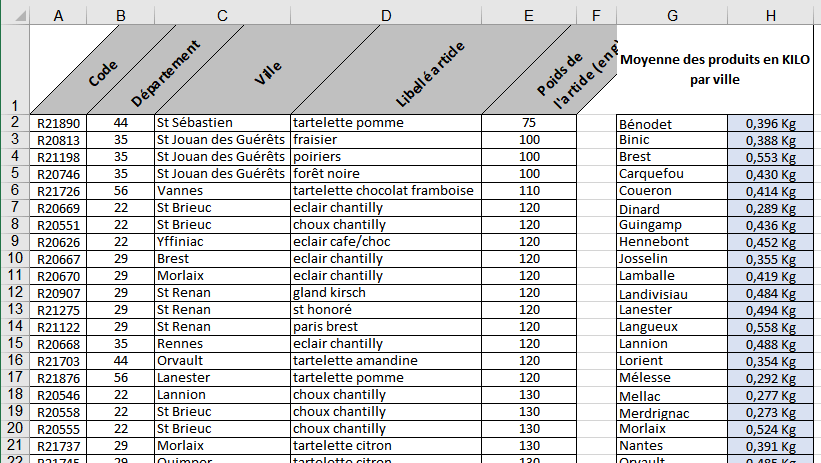 Dans la colonne H, vous calculez la moyenne du poids des produits vendu dans chaque ville. Vous affichez le poids en KILO et 3 chiffres après la virgule.