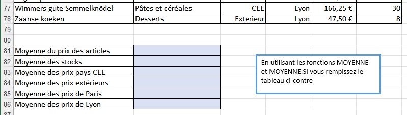 Vous pouvez télécharger votre fichier de travail ci-contre.En utilisant les fonctions MOYENNE et MOYENNE.SI vous remplissez le tableau ci-contre.