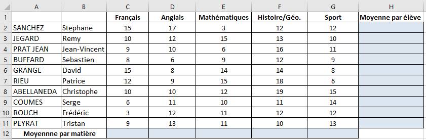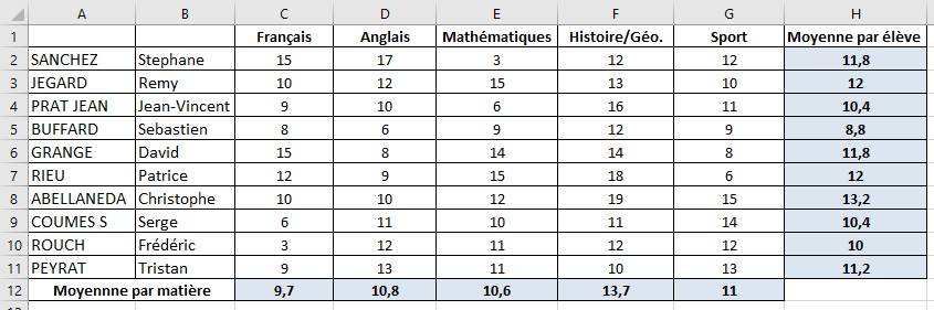 CONSIGNES :À la veille d’un conseil de classe, les différents professeurs vous remettent les informations suivantes :Dans un tableau, faites ressortir la moyenne par élève, et la moyenne par classe.