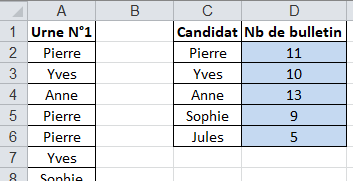 Vous déterminez avec la fonction NB.SI le nombre de votes recueilli par chaque personne dans l'urne N°1