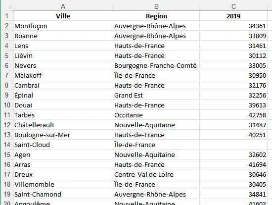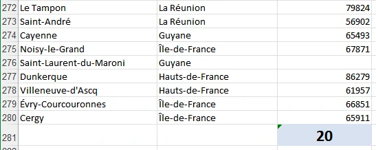 CONSIGNES :Vous téléchargez ci-contre la liste des 280 villes de France les plus peuplées. Vous déterminez le nombre ville pour lesquelles la population n'est pas indiquée.
