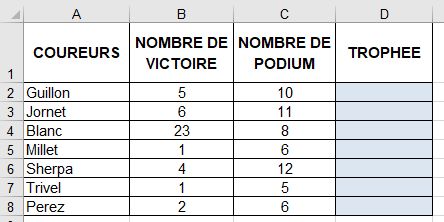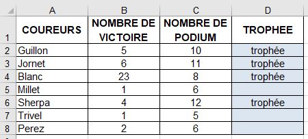Après avoir reproduit le tableau ci-dessus, vous devez faire sortir le mot "Trophée" si le coureur à 5 victoires ou plus de 10 podiums.