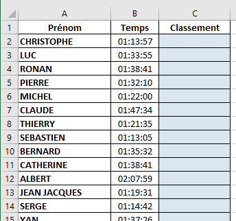 Sans utiliser les fonctions tri, insérer en C2 la formule qui classera les coureurs du plus rapide au moins rapide. Pensez à utiliser $ pour bloquer les bonnes cellules si vous utilisez la poignée de recopie