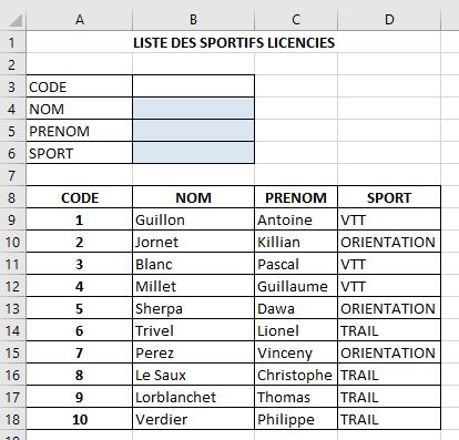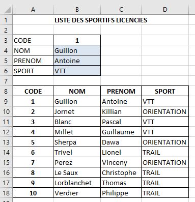 Avec la fonction "recherchev" vous automatisez le calcul des cellules B4 à B6. La cellule B3 est à saisir avec un code existant, par exemple le code 6 donnera l'identité complète en B4,B5 et B6 : Trivel, Lionel et Trail